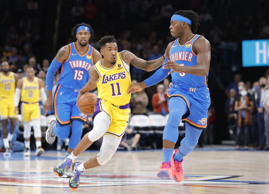 Oct 27, 2021; Oklahoma City, Oklahoma, USA; Los Angeles Lakers guard Malik Monk (11) drives down the court as Oklahoma City Thunder forward Luguentz Dort (5) defends during the first quarter at Paycom Center. Mandatory Credit: Alonzo Adams-USA TODAY Sports