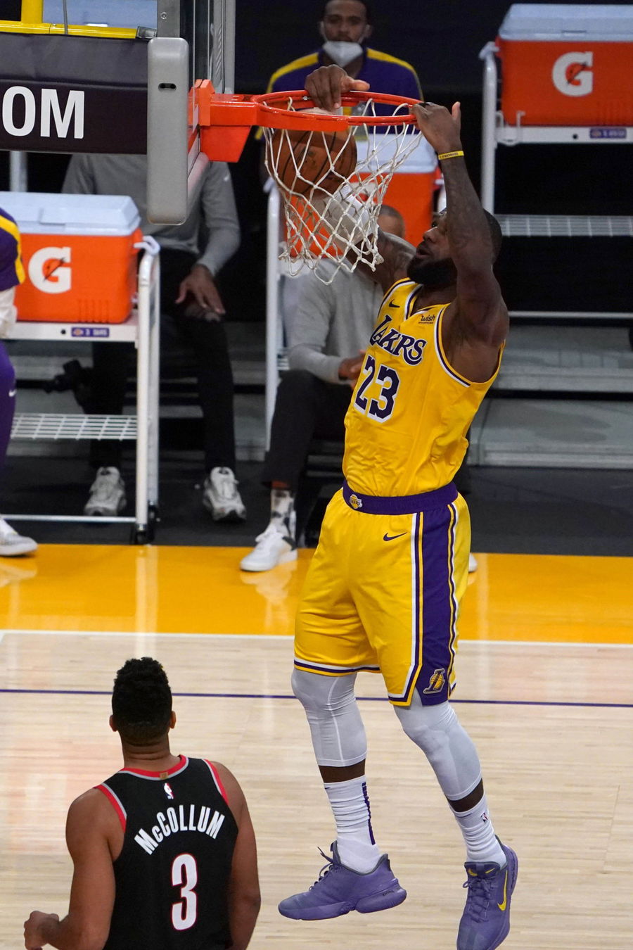 Dec 28, 2020; Los Angeles, California, USA; Los Angeles Lakers forward LeBron James (23) dunks the ball over Portland Trail Blazers guard CJ McCollum (3) in the third quarter at Staples Center. Mandatory Credit: Kirby Lee-USA TODAY Sports