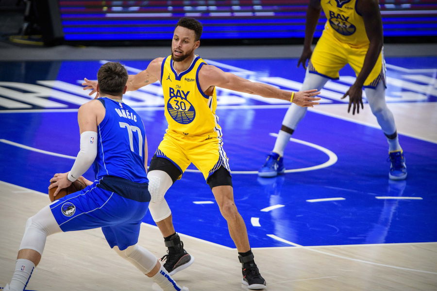 Feb 4, 2021; Dallas, Texas, USA; Dallas Mavericks guard Luka Doncic (77) and Golden State Warriors guard Stephen Curry (30) in action during the game between the Dallas Mavericks and the Golden State Warriors at the American Airlines Center. Mandatory Credit: Jerome Miron-USA TODAY Sports