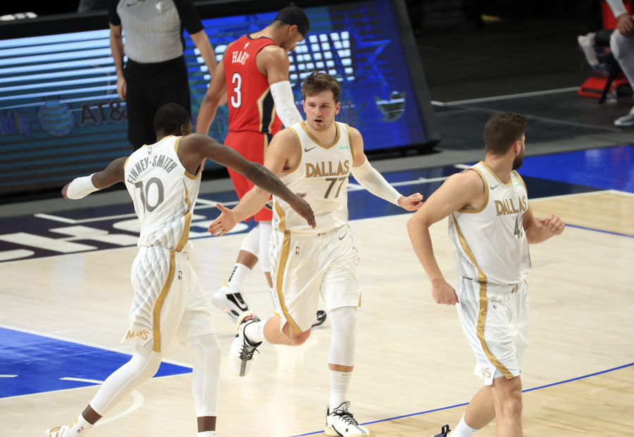 Feb 12, 2021; Dallas, Texas, USA; Dallas Mavericks guard Luka Doncic (77) celebrates with forward Dorian Finney-Smith (10) during the second half against the New Orleans Pelicans at American Airlines Center. Mandatory Credit: Kevin Jairaj-USA TODAY Sports