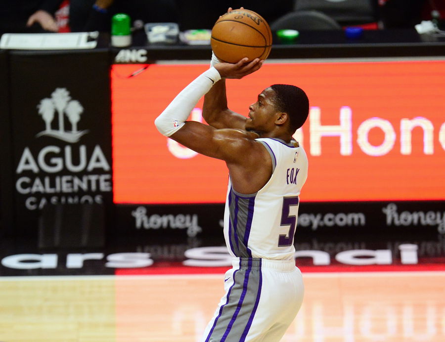 Feb 7, 2021; Los Angeles, California, USA; Sacramento Kings guard De’Aaron Fox (5) shoot against the Los Angeles Clippers during the second half at Staples Center. Mandatory Credit: Gary A. Vasquez-USA TODAY Sports