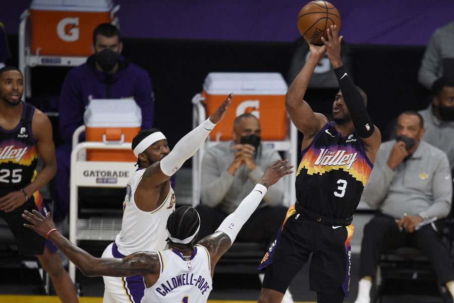 May 9, 2021; Los Angeles, California, USA; Phoenix Suns guard Chris Paul (3) goes up for a shot while Los Angeles Lakers guard Wesley Matthews (9) and guard Kentavious Caldwell-Pope (1) defends during the first half at Staples Center. Mandatory Credit: Kelvin Kuo-USA TODAY Sports | Courtesy: Reuters
