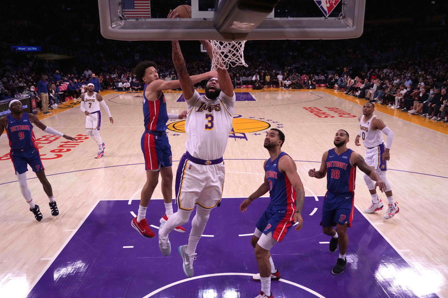 Nov 28, 2021; Los Angeles, California, USA; Los Angeles Lakers forward Anthony Davis (3) shoots the ball against the Detroit Pistons in the first half at Staples Center. The Lakers defeated the Pistons 110-106. Mandatory Credit: Kirby Lee-USA TODAY Sports