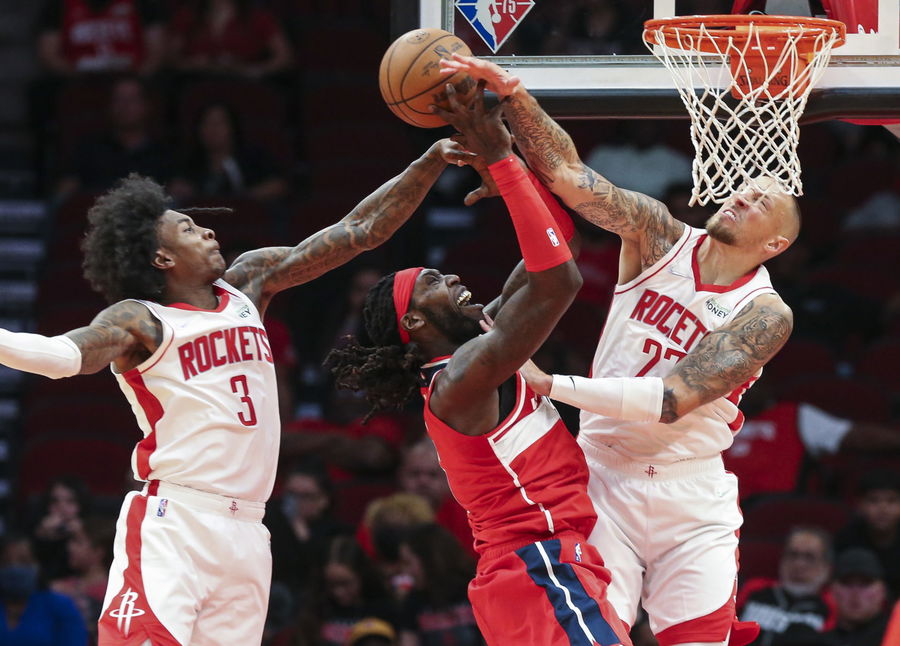 Oct 5, 2021; Houston, Texas, USA; Washington Wizards center Montrezl Harrell (6) shoots the ball against Houston Rockets guard Kevin Porter Jr. (3) and center Daniel Theis (27) during the second quarter at Toyota Center. Mandatory Credit: Troy Taormina-USA TODAY Sports