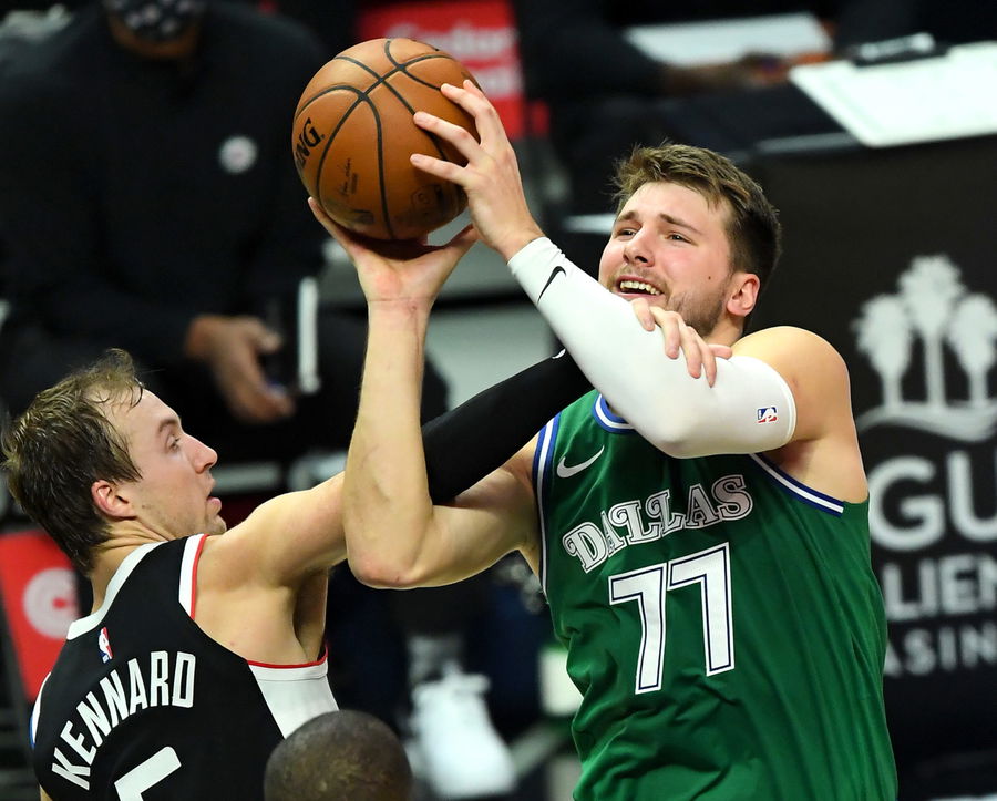 Dec 27, 2020; Los Angeles, California, USA; Dallas Mavericks guard Luka Doncic (77) is fouled by Los Angeles Clippers guard Luke Kennard (5) in the second half at Staples Center. Mandatory Credit: Jayne Kamin-Oncea-USA TODAY Sports