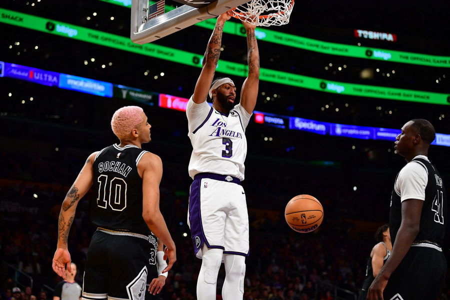 Nov 20, 2022; Los Angeles, California, USA; Los Angeles Lakers forward Anthony Davis (3) dunks for the basket against the San Antonio Spurs during the second half at Crypto.com Arena. Mandatory Credit: Gary A. Vasquez-USA TODAY Sports