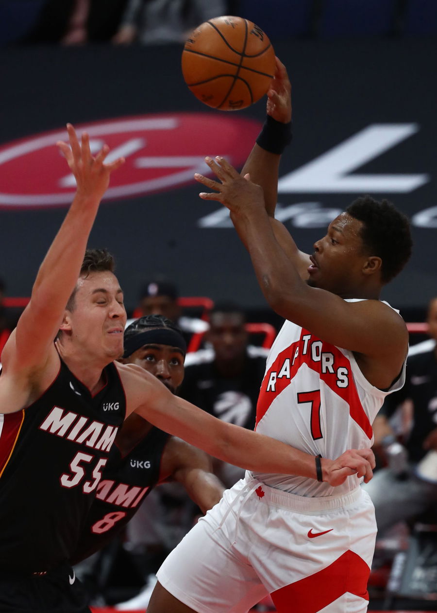 Dec 18, 2020; Tampa, Florida, USA; Toronto Raptors guard Kyle Lowry (7) shoots as Miami Heat guard Duncan Robinson (55) defends during the first quarter at Amalie Arena. Mandatory Credit: Kim Klement-USA TODAY Sports