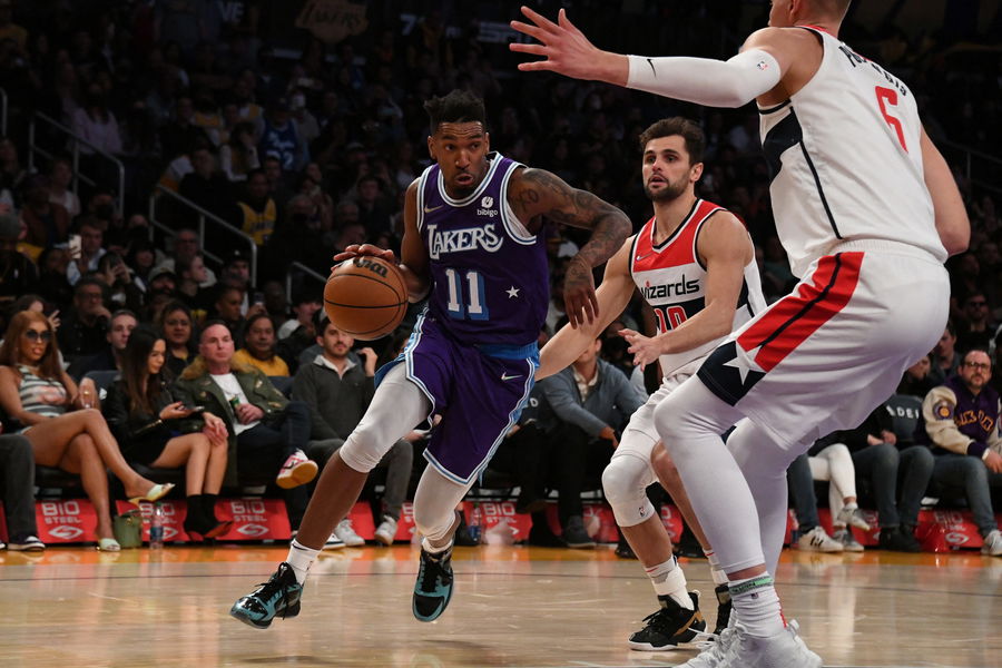 Mar 11, 2022; Los Angeles, California, USA; Los Angeles Lakers guard Malik Monk (11) drives against Washington Wizards guard Raul Neto (19) and center Kristaps Porzingis (6) in the fourth quarter at Crypto.com Arena. Mandatory Credit: Richard Mackson-USA TODAY Sports