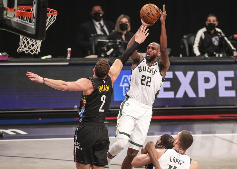 Jun 7, 2021; Brooklyn, New York, USA; Milwaukee Bucks forward Khris Middleton (22) shoots over Brooklyn Nets forward Blake Griffin (2) in the second quarter during game two in the second round of the 2021 NBA Playoffs. at Barclays Center. Mandatory Credit: Wendell Cruz-USA TODAY Sports