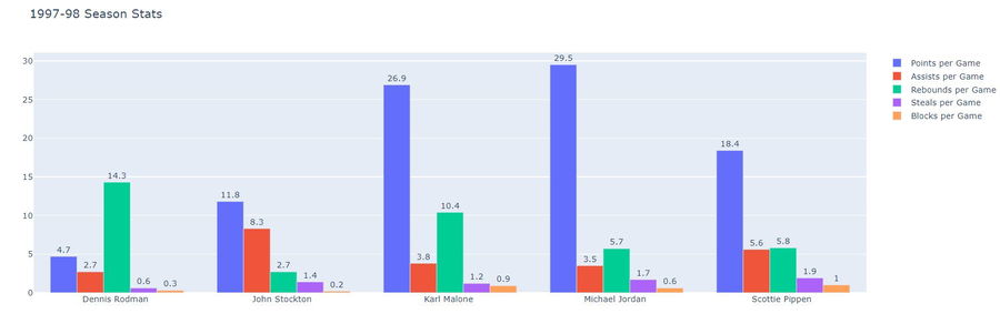 1997-98 Season Averages of Michael Jordan, Scottie Pippen, Dennis Rodman, John Stockton, and Karl Malone