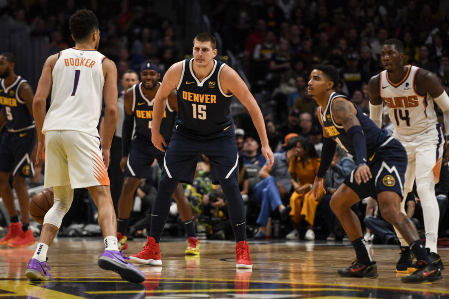 DENVER, CO – NOVEMBER 24: Nikola Jokic (15) of the Denver Nuggets and Gary Harris (14) double team Devin Booker (1) of the Phoenix Suns during the fourth quarter of Denver’s 116-104 win on Sunday, November 24, 2019. (Photo by AAron Ontiveroz/MediaNews Group/The Denver Post via Getty Images)