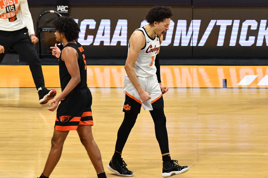 Mar 21, 2021; Indianapolis, Indiana, USA; Oklahoma State Cowboys guard Cade Cunningham (2) reacts during the second half in the second round of the 2021 NCAA Tournament against the Oregon State Beavers at Hinkle Fieldhouse. Mandatory Credit: Patrick Gorski-USA TODAY Sports