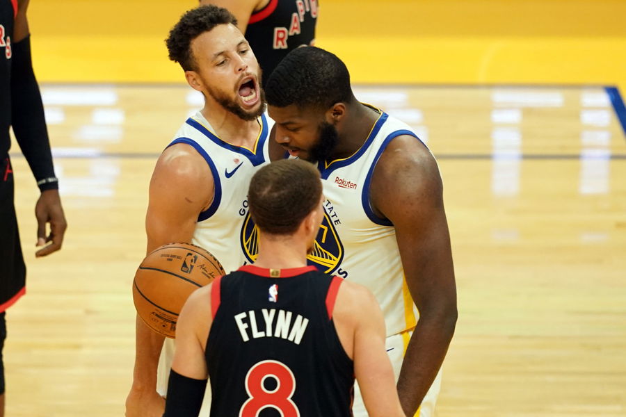 Jan 10, 2021; San Francisco, California, USA; Golden State Warriors guard Stephen Curry (30) reacts after a basket by forward Eric Paschall (7) during the third quarter against the Toronto Raptors at Chase Center. Mandatory Credit: Darren Yamashita-USA TODAY Sports