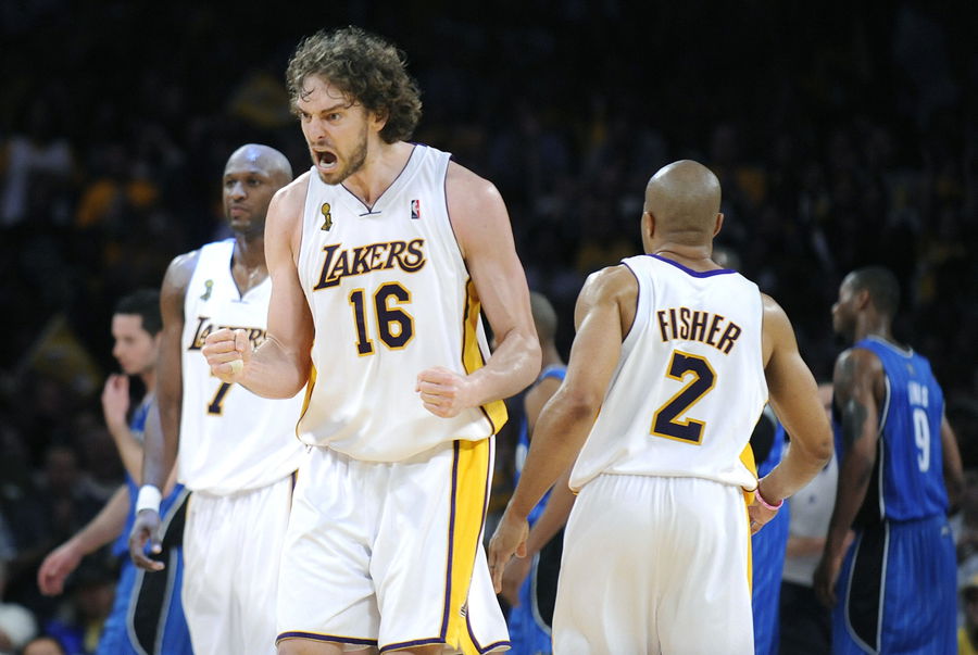 Lakers Pau Gasol celebrates his threepoint play in overtime agasint the Magic in Game 2 of the NBA Championship at the Staples Center Thursday. (Photo by Wally Skalij/Los Angeles Times via Getty Images)