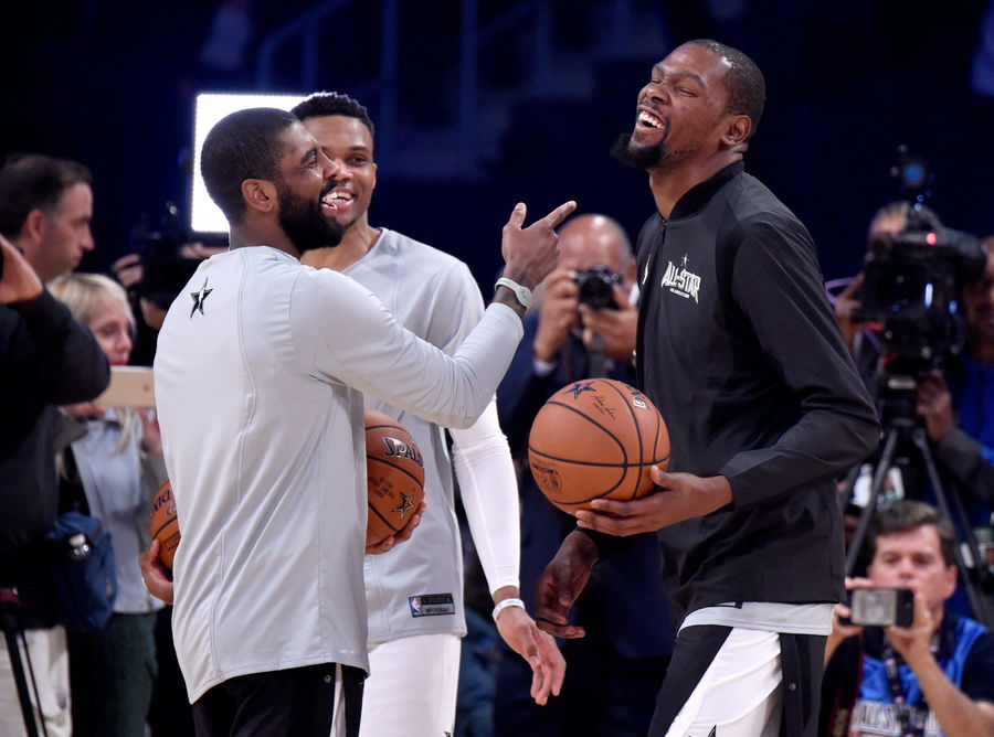 Kyrie Irving, Russell Westbrook, and Kevin Durant warm up at the 67th NBA All-Star Game: Team LeBron Vs. Team Stephen at Staples Center on February 18, 2018, in Los Angeles, California. (Photo by Kevin Mazur/WireImage)