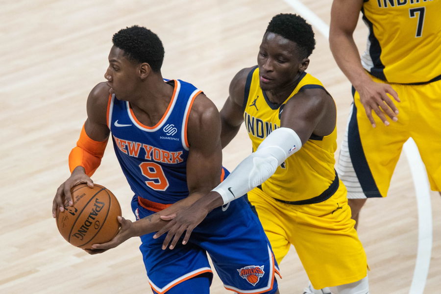 Jan 2, 2021; Indianapolis, Indiana, USA; New York Knicks guard RJ Barrett (9) dribbles the ball against Indiana Pacers guard Victor Oladipo (4) in the fourth quarter at Bankers Life Fieldhouse. Mandatory Credit: Trevor Ruszkowski-USA TODAY Sports