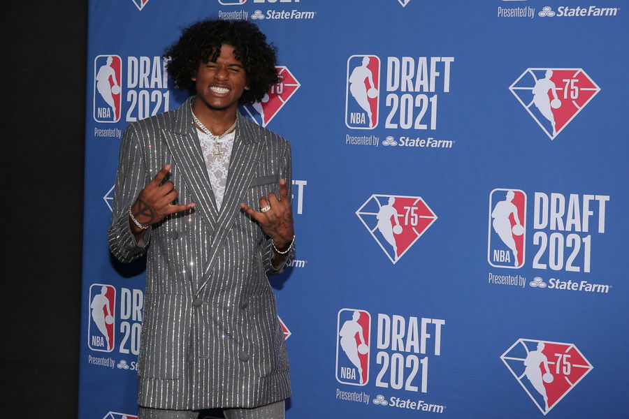 Jul 29, 2021; Brooklyn, New York, USA; Jalen Green (G League Ignite) arrives on the red carpet before the 2021 NBA Draft at Barclays Center. Mandatory Credit: Brad Penner-USA TODAY Sports