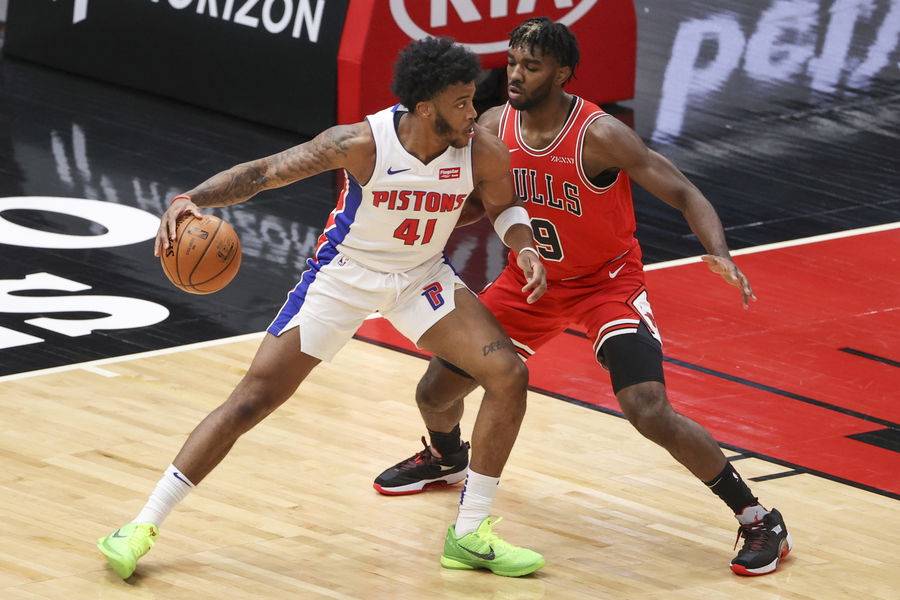 Feb 17, 2021; Chicago, Illinois, USA; Chicago Bulls forward Patrick Williams (9) defends against Detroit Pistons forward Saddiq Bey (41) during the first half of an NBA game at United Center. Mandatory Credit: Kamil Krzaczynski-USA TODAY Sports