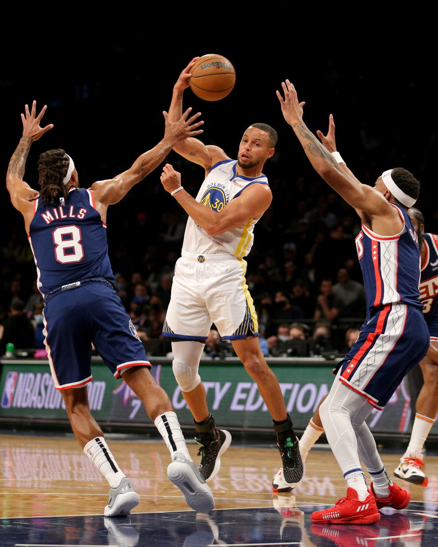 Nov 16, 2021; Brooklyn, New York, USA; Golden State Warriors guard Stephen Curry (30) passes the ball while defended by Brooklyn Nets guard Patty Mills (8) and forward Bruce Brown (1) during the first quarter at Barclays Center. Mandatory Credit: Brad Penner-USA TODAY Sports