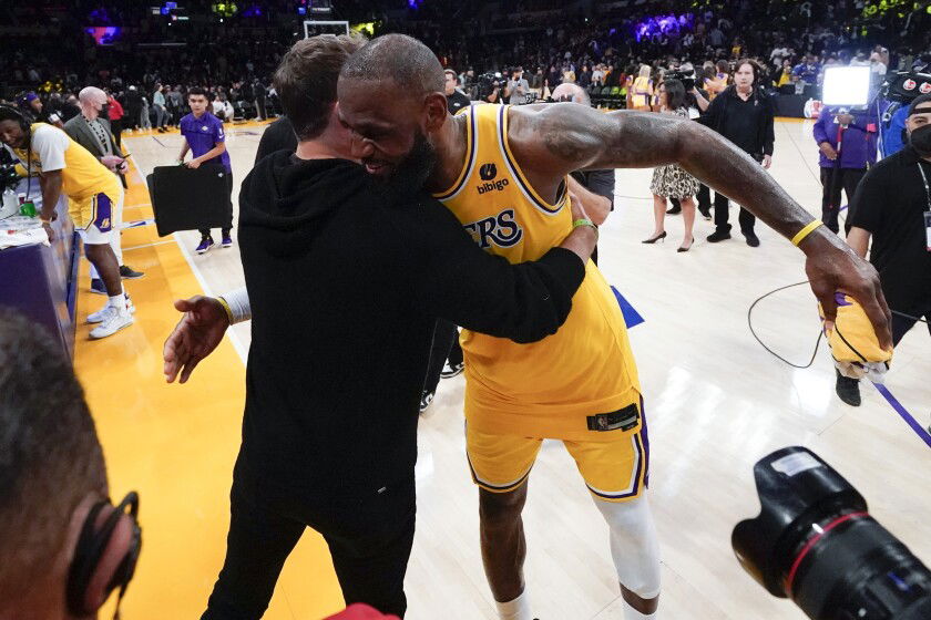 Feb 16, 2022; Los Angeles, California, USA; Los Angeles Lakers forward LeBron James (6) acknowledges the crowd after he was introduced as the NBA?s all time leading scorer during in the first half of the game against the Utah Jazz at Crypto.com Arena. Mandatory Credit: Jayne Kamin-Oncea-USA TODAY Sports