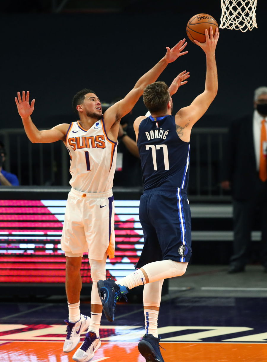 Dec 23, 2020; Phoenix, Arizona, USA; Phoenix Suns guard Devin Booker (1) defends against Dallas Mavericks forward Luka Doncic (77) in the first half at Phoenix Suns Arena. Mandatory Credit: Mark J. Rebilas-USA TODAY Sports