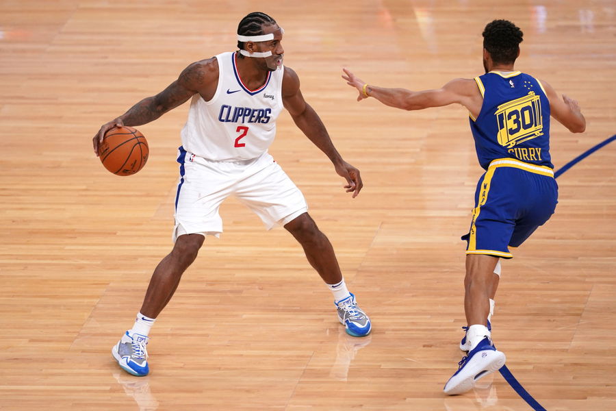 Jan 6, 2021; San Francisco, California, USA; Los Angeles Clippers forward Kawhi Leonard (2) dribbles the ball next to Golden State Warriors guard Stephen Curry (30) in the second quarter at the Chase Center. Mandatory Credit: Cary Edmondson-USA TODAY Sports