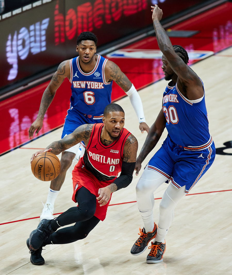 Jan 24, 2021; Portland, Oregon, USA; Portland Trail Blazers guard Damian Lillard (0) drives to the basket past New York Knicks forward Julius Randle (30) during the first quarter at the Moda Center. Mandatory Credit: Craig Mitchelldyer-USA TODAY Sports