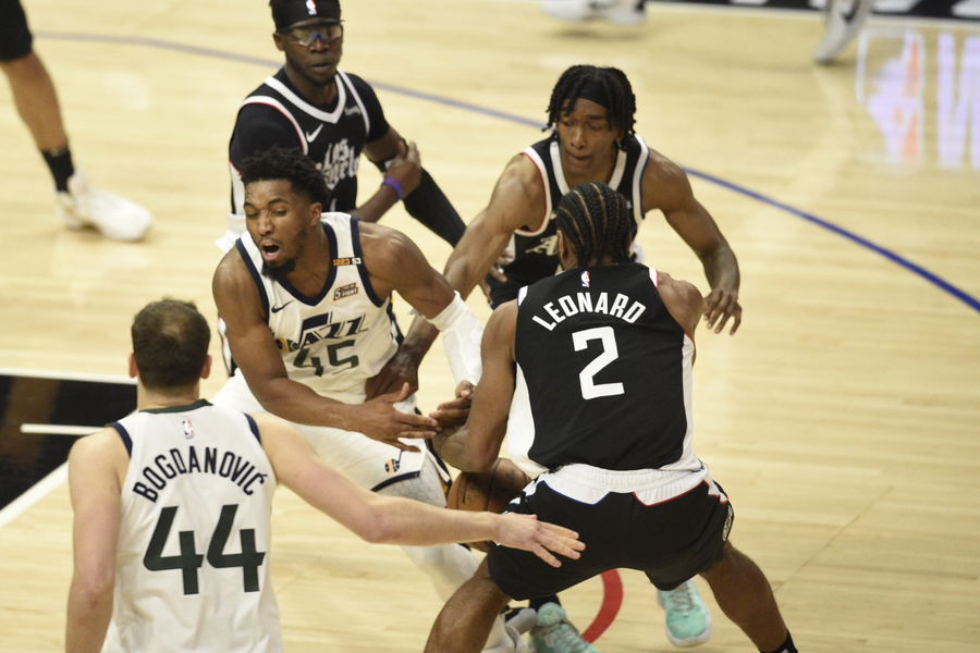 Jun 12, 2021; Los Angeles, California, USA; LA Clippers forward Kawhi Leonard (2) steals the ball from Utah Jazz guard Donovan Mitchell (45) in the second quarter during game three in the second round of the 2021 NBA Playoffs. at Staples Center. Mandatory Credit: Kelvin Kuo-USA TODAY Sports