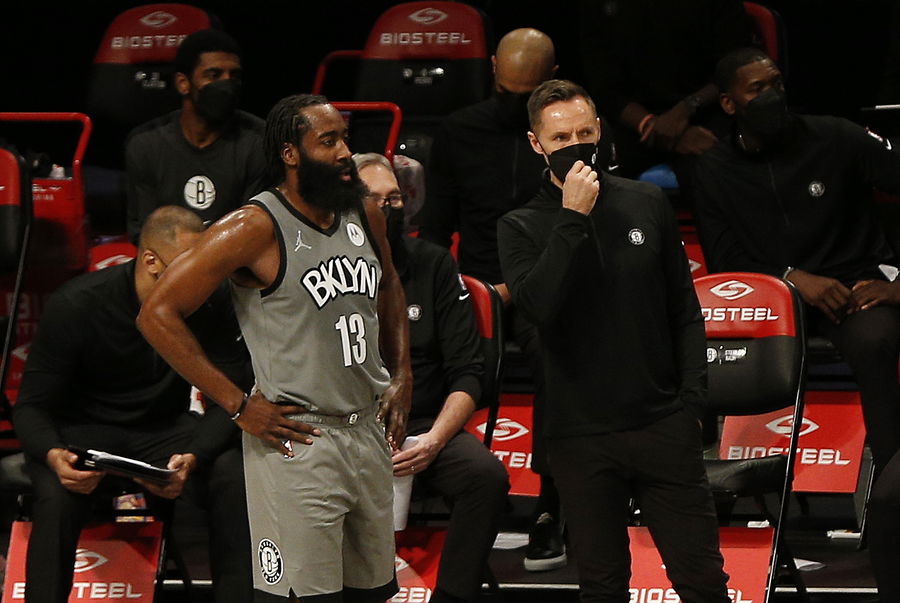 Jan 25, 2021; Brooklyn, New York, USA; Brooklyn Nets guard James Harden (13) and head coach Steve Nash talk against the Miami Heat during the second half at Barclays Center. Mandatory Credit: Andy Marlin-USA TODAY Sports