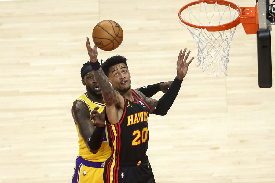 Feb 1, 2021; Atlanta, Georgia, USA; Atlanta Hawks forward John Collins (20) grabs a rebound against the Los Angeles Lakers in the second quarter at State Farm Arena. Mandatory Credit: Brett Davis-USA TODAY Sports