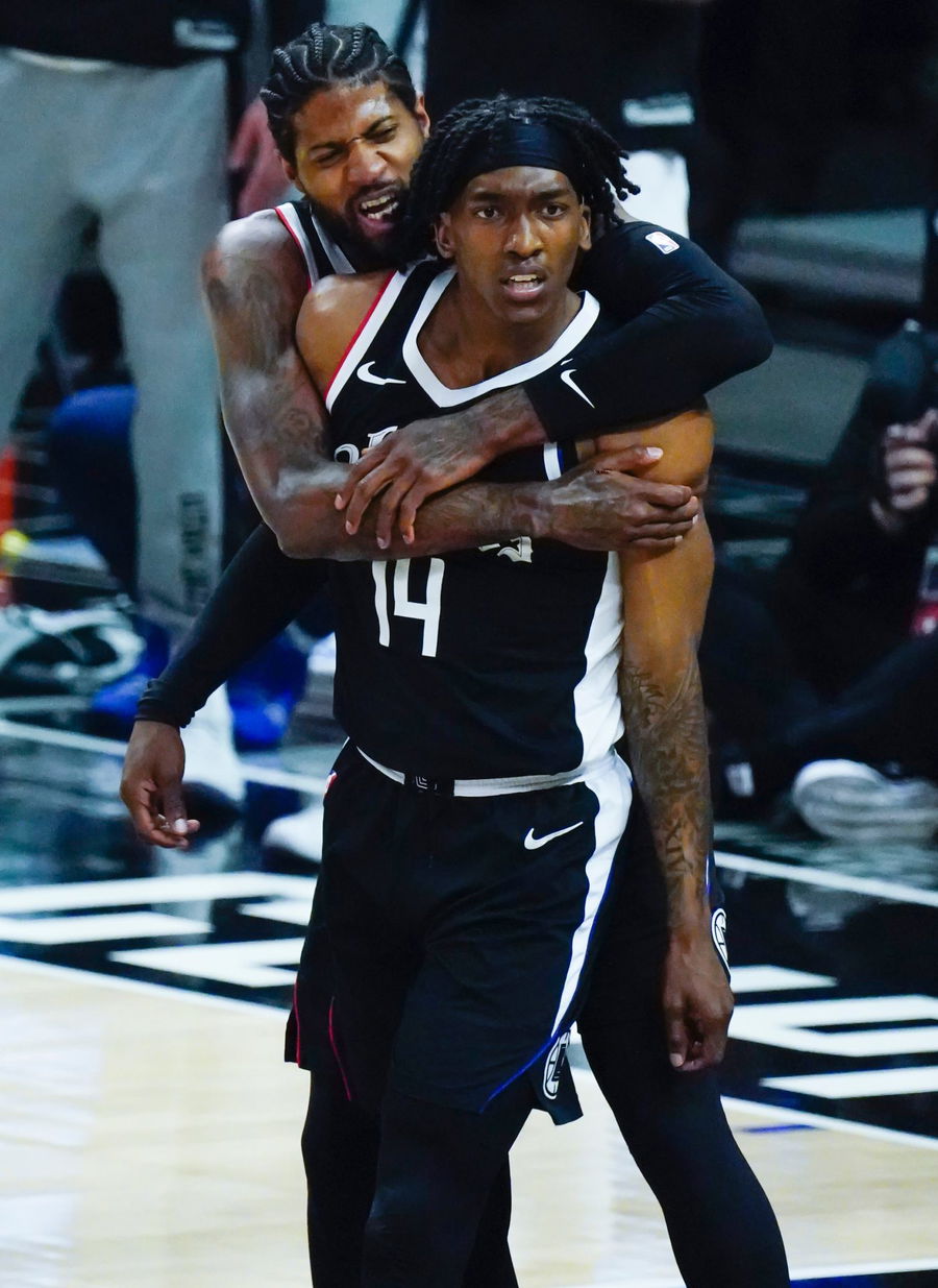 Jun 18, 2021; Los Angeles, California, USA; LA Clippers guard Terance Mann (14) is hugged by teammate Paul George after a first quarter slam dunk against the Utah Jazz during game six in the second round of the 2021 NBA Playoffs. at Staples Center. Mandatory Credit: Robert Hanashiro-USA TODAY Sports