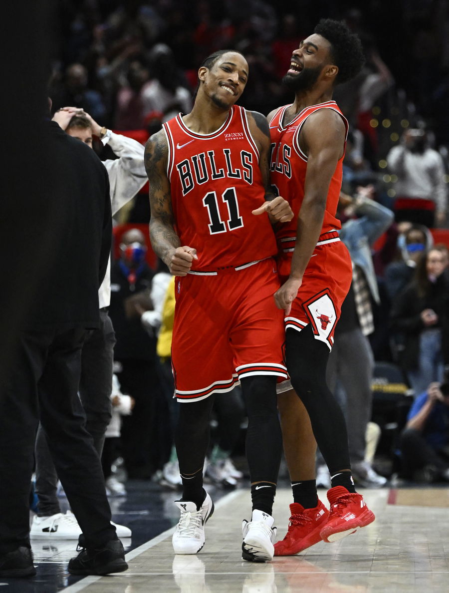 Jan 1, 2022; Washington, District of Columbia, USA; Chicago Bulls forward DeMar DeRozan (11) is congratulated by guard Coby White (0) after hitting a game winning three point basket against the Washington Wizards during the second half at Capital One Arena. Mandatory Credit: Brad Mills-USA TODAY Sports