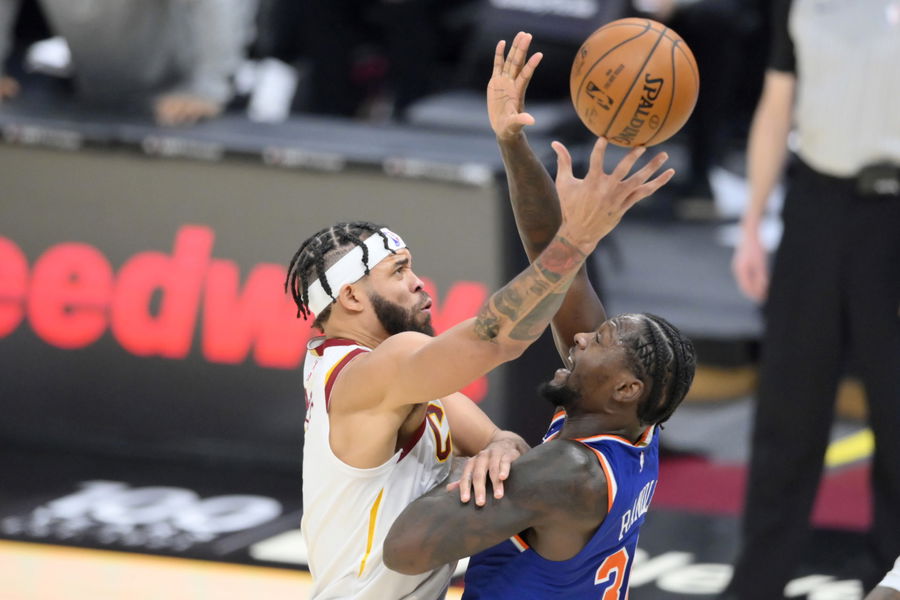 Dec 29, 2020; Cleveland, Ohio, USA; Cleveland Cavaliers center JaVale McGee (6) drives against New York Knicks forward Julius Randle (30) in the third quarter at Rocket Mortgage FieldHouse. Mandatory Credit: David Richard-USA TODAY Sports