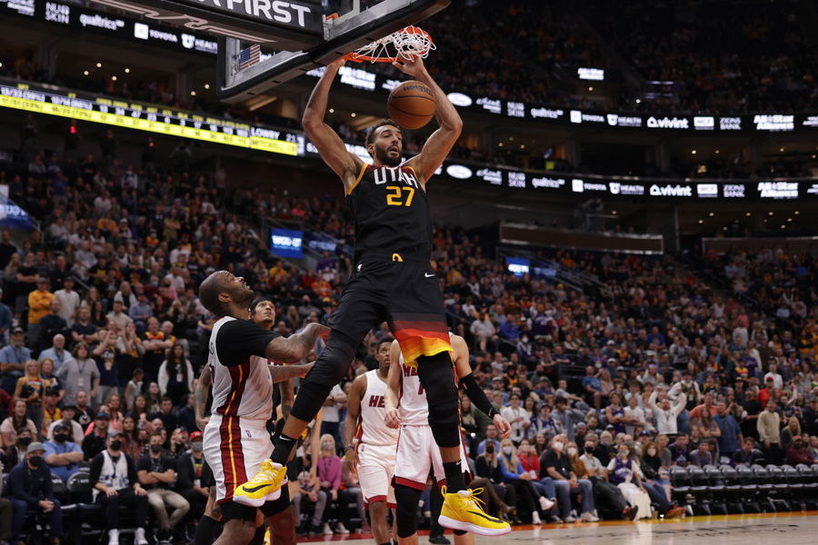 Nov 13, 2021; Salt Lake City, Utah, USA; Utah Jazz center Rudy Gobert (27) dunks the basketball during the second half against the Miami Heat at Vivint Arena. Miami Heat won 111-105. Mandatory Credit: Chris Nicoll-USA TODAY Sports