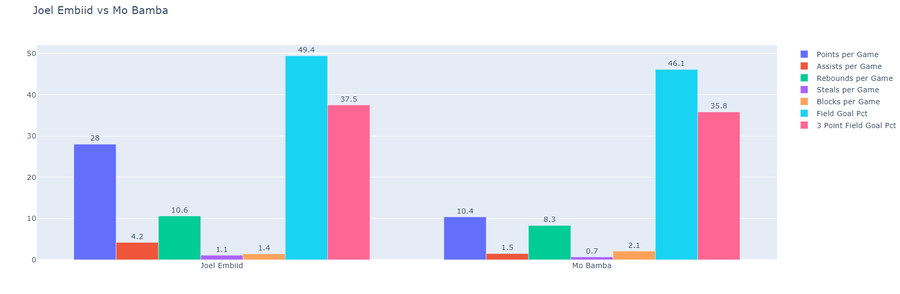 2021-22 NBA Regular Season Averages of Joel Embiid and Mo Bamba (valid as of 20th Jan 2022)