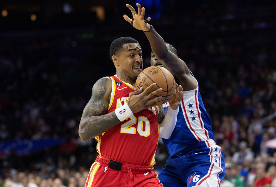 Nov 28, 2022; Philadelphia, Pennsylvania, USA; Atlanta Hawks forward John Collins (20) drives against Philadelphia 76ers guard Shake Milton (18) during the first quarter at Wells Fargo Center. Mandatory Credit: Bill Streicher-USA TODAY Sports