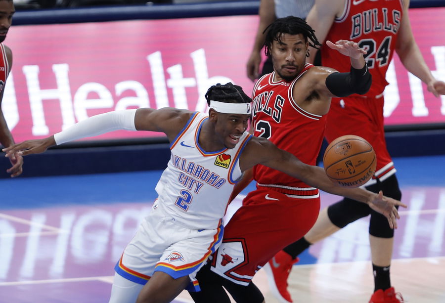 Dec 18, 2020; Oklahoma City, Oklahoma, USA; Oklahoma City Thunder guard Shai Gilgeous-Alexander (2) and Chicago Bulls forward Otto Porter Jr. (22) compete for a loose ball during the second quarter at Chesapeake Energy Arena. Mandatory Credit: Alonzo Adams-USA TODAY Sports