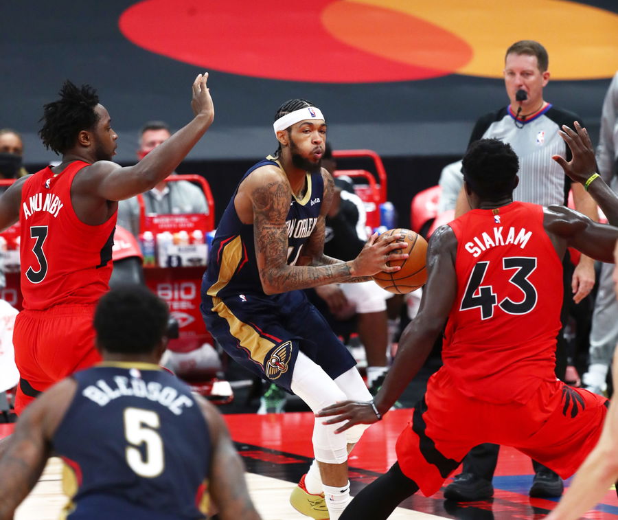 Dec 23, 2020; Tampa, Florida, USA; New Orleans Pelicans forward Brandon Ingram (14) moves to the basket as Toronto Raptors forward Pascal Siakam (43) defends during the second quarter at Amalie Arena. Mandatory Credit: Kim Klement-USA TODAY Sports