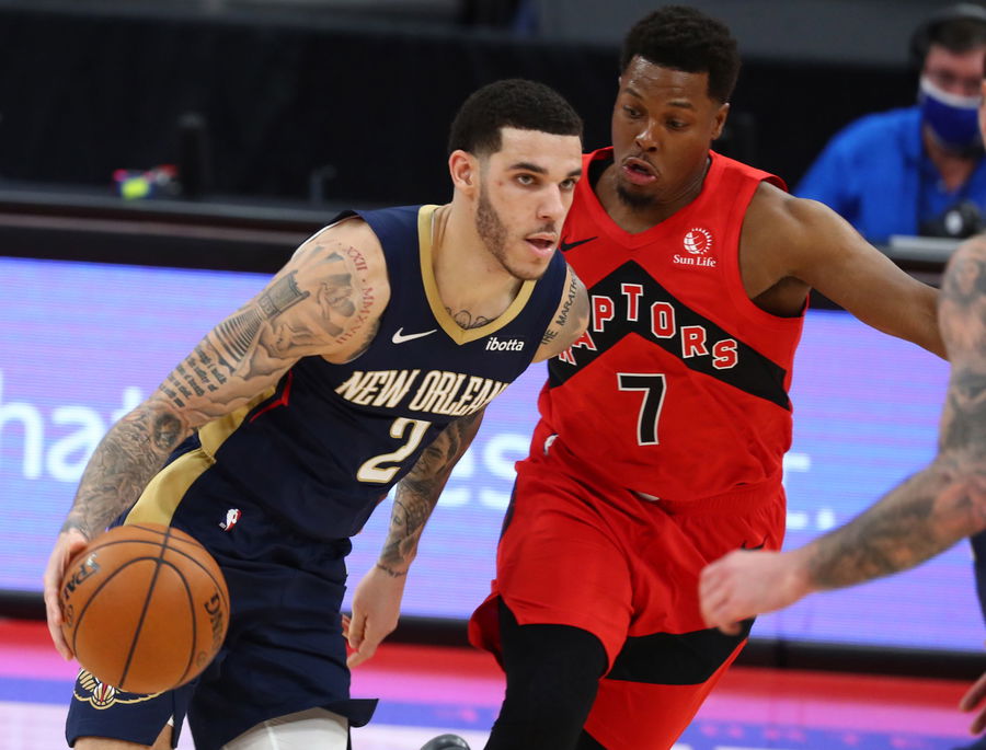 Dec 23, 2020; Tampa, Florida, USA; New Orleans Pelicans guard Lonzo Ball (2) drives to the basket as Toronto Raptors guard Kyle Lowry (7) defends during the first quarter at Amalie Arena. Mandatory Credit: Kim Klement-USA TODAY Sports