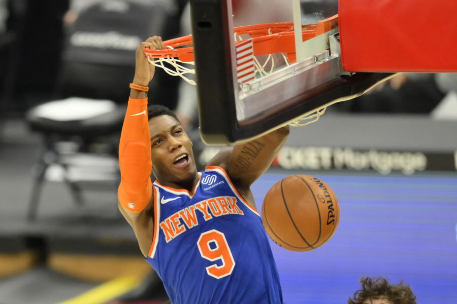Dec 29, 2020; Cleveland, Ohio, USA; New York Knicks guard RJ Barrett (9) dunks in the second quarter against the Cleveland Cavaliers at Rocket Mortgage FieldHouse. Mandatory Credit: David Richard-USA TODAY Sports