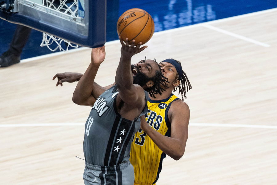 Mar 17, 2021; Indianapolis, Indiana, USA; Brooklyn Nets guard James Harden (13) shoots the ball while Indiana Pacers center Myles Turner (33) defends in the fourth quarter at Bankers Life Fieldhouse. Mandatory Credit: Trevor Ruszkowski-USA TODAY Sports