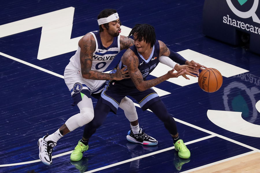 Dec 14, 2020; Minneapolis, Minnesota, USA; Minnesota Timberwolves guard D’Angelo Russell (0) tries to steal the ball from Memphis Grizzlies guard Ja Morant (12) in the first quarter at Target Center. Mandatory Credit: Brad Rempel-USA TODAY Sports