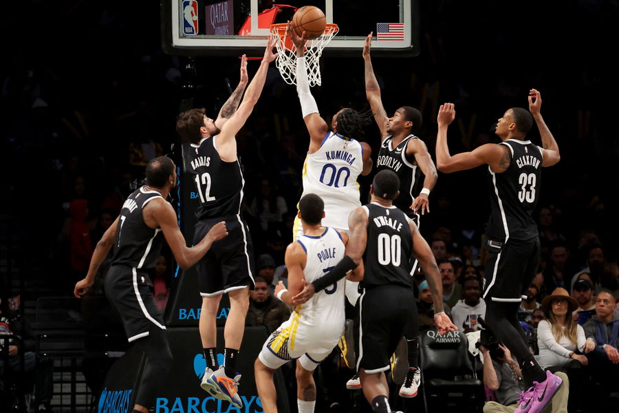 Dec 21, 2022; Brooklyn, New York, USA; Golden State Warriors forward Jonathan Kuminga (00) drives to the basket against Brooklyn Nets forward Joe Harris (12) and guard Edmond Sumner (4) and center Nic Claxton (33) and forward Kevin Durant (7) and forward Royce O’Neale (00) during the third quarter at Barclays Center. Mandatory Credit: Brad Penner-USA TODAY Sports