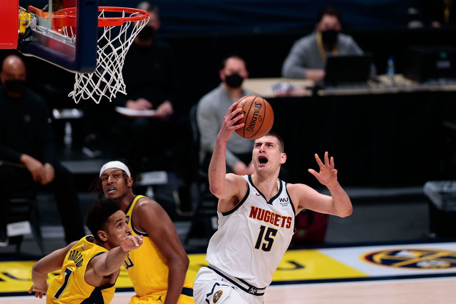 Mar 15, 2021; Denver, Colorado, USA; Denver Nuggets center Nikola Jokic (15) drives to the net against Indiana Pacers guard Malcolm Brogdon (7) in the first quarter at Ball Arena. Mandatory Credit: Isaiah J. Downing-USA TODAY Sports