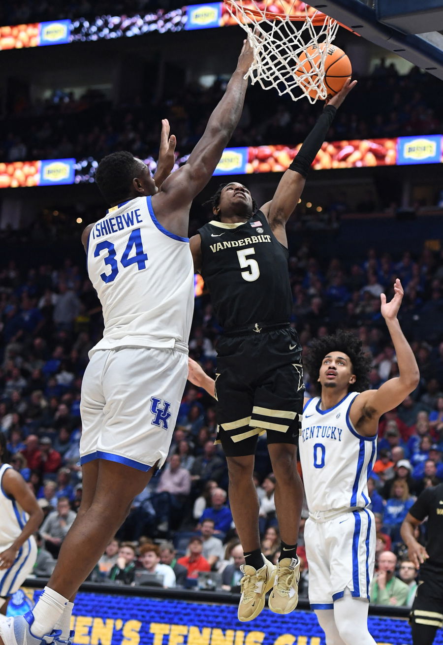 Mar 10, 2023; Nashville, TN, USA; Vanderbilt Commodores guard Ezra Manjon (5) scores against Kentucky Wildcats forward Oscar Tshiebwe (34) during the second half at Bridgestone Arena. Mandatory Credit: Christopher Hanewinckel-USA TODAY Sports