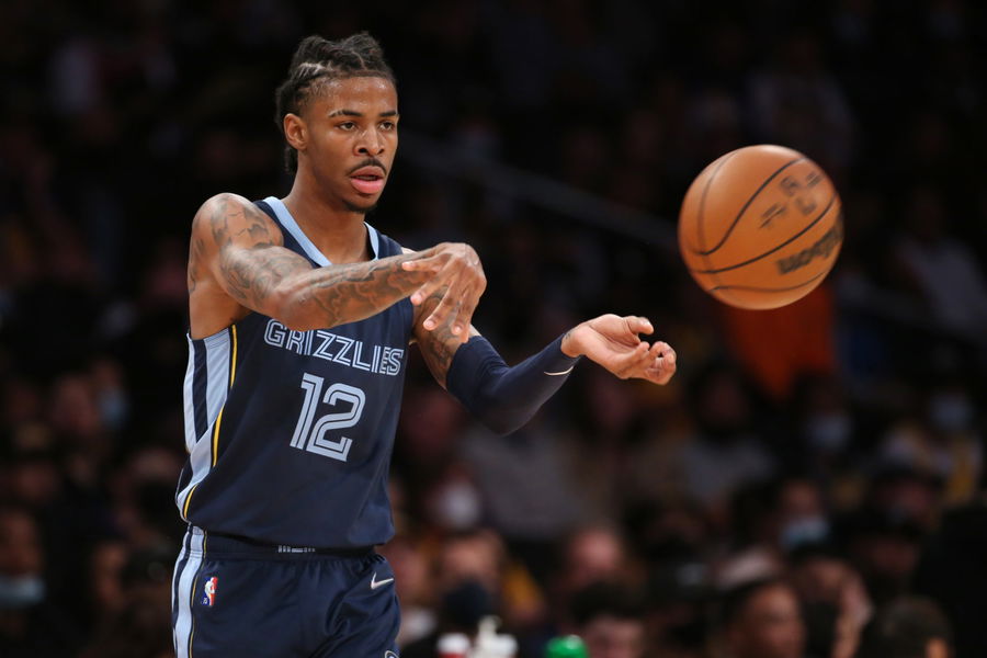 Oct 24, 2021; Los Angeles, California, USA; Memphis Grizzlies guard Ja Morant (12) passes a ball during the game against the Los Angeles Lakers at Staples Center. The Lakers won 121-118. Mandatory Credit: Kiyoshi Mio-USA TODAY Sports