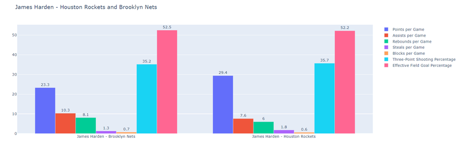 As it can be seen, James Harden has become more of a rebounder and a playmaker on the Nets as compared to being a scorer for the Rockets. This could be attributed to Kevin Durant’s absence due to injury and Kyrie Irving only playing away games for the Nets. His scoring for the Rockets is large, primarily because of the number of games he played for them, as well as being the sole offensive point of focus for the team. What is left is for Harden to win a title, and time alone can answer the question as to when that might happen.