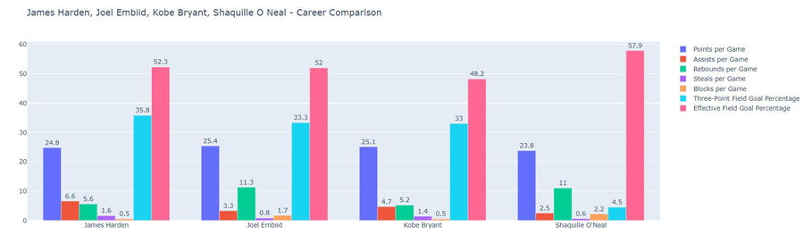 James Harden, Joel Embiid, Kobe Bryant, Shaquille O’Neal – Career Comparison (Stats valid as of 20th Feb 2022)