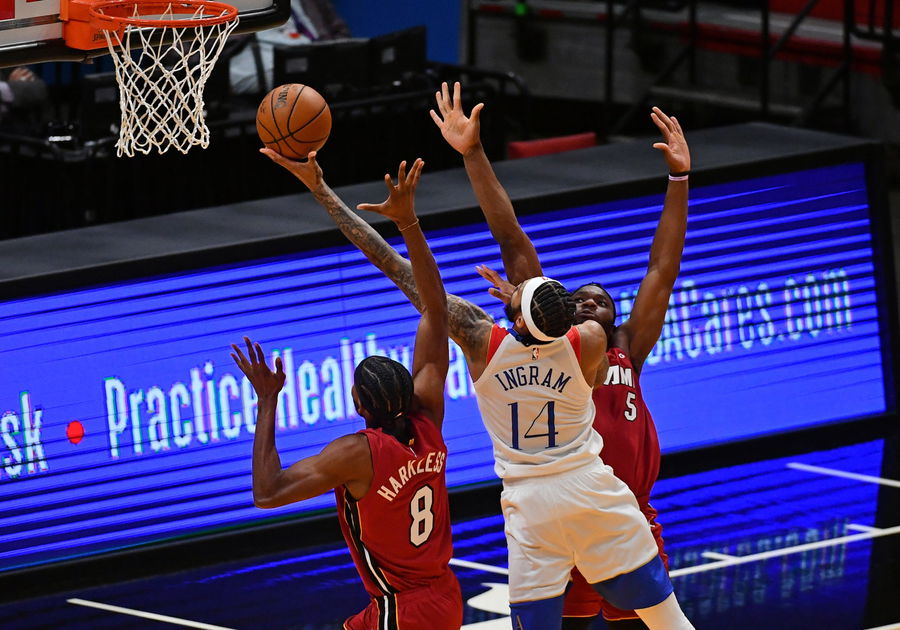 Dec 25, 2020; Miami, Florida, USA; New Orleans Pelicans forward Brandon Ingram (14) shoots between Miami Heat forward Precious Achiuwa (5) and forward Maurice Harkless (8) during the second half at American Airlines Arena. Mandatory Credit: Jasen Vinlove-USA TODAY Sports