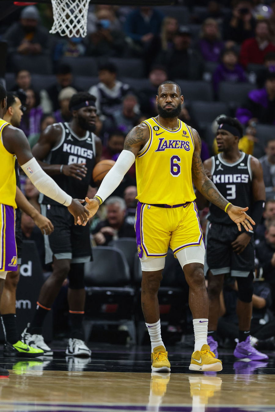 Dec 21, 2022; Sacramento, California, USA; Los Angeles Lakers forward LeBron James (6) reacts after a play during the second quarter against the Sacramento Kings at Golden 1 Center. Mandatory Credit: Sergio Estrada-USA TODAY Sports
